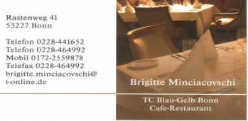 In diesem Jahr sind es schon 20 Jahre, dass das Pächterehepaar Liviu und Brigitte Minciacovschi mit einem reichhaltigen Angebot für das leibliche Wohl der Mitglieder des TC Blau-Gelb Bonn-Beuel 1960 e.V. sorgen. Neben dem Sportbetrieb ist eine gute Gastronomie einer der wichtigsten Bausteine für ein funktionierendes Clubleben. Ein gemeinsames Glas Bier oder Glas Wein auf der Sonnenterrasse fördert das gesellige Beisammensein der Vereinsmitglieder.